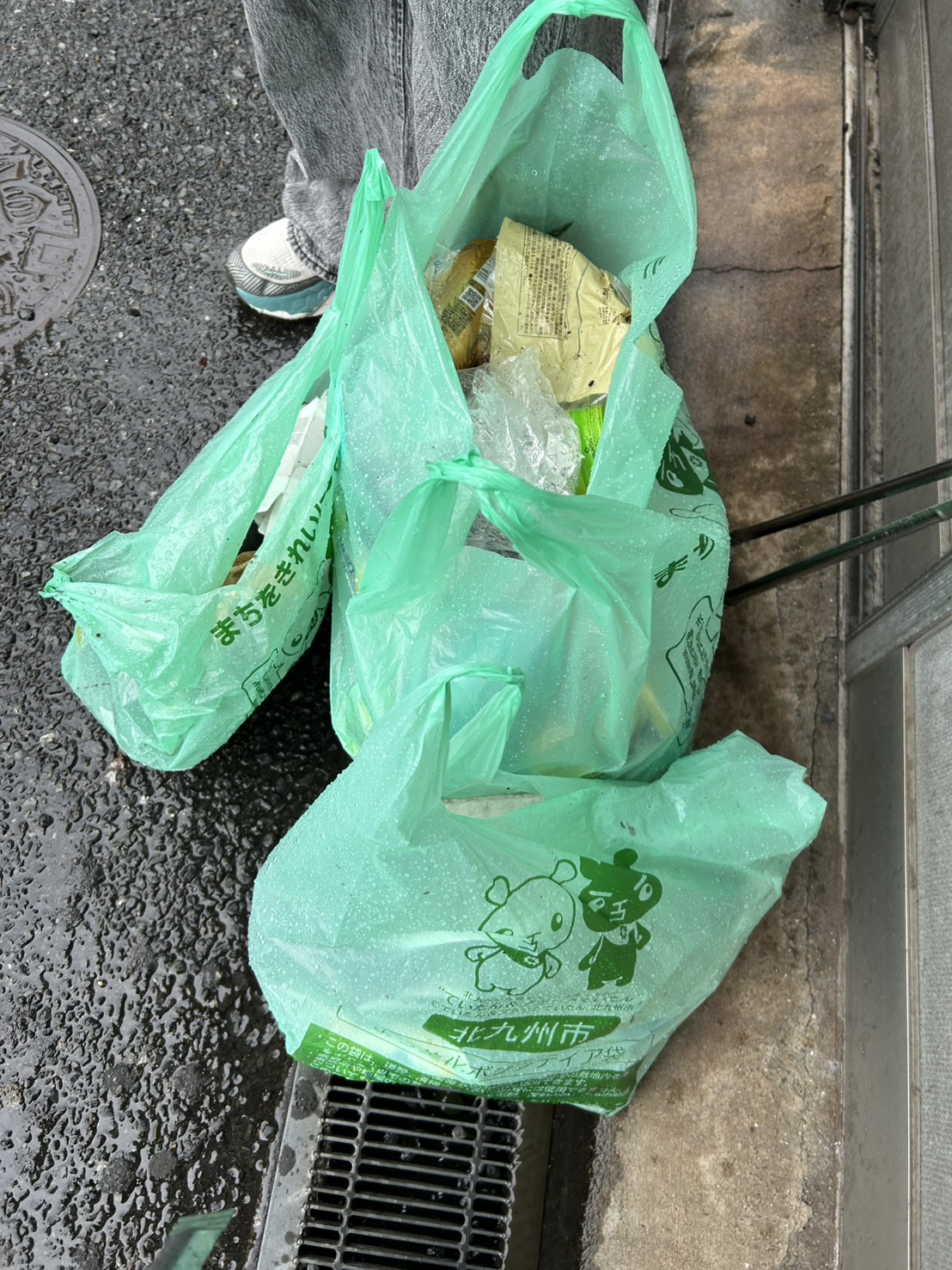 道中でごみを拾いながら進んでいくのですが、序盤からあいにくの雨が降り出し、アーケード通りを進んでいる間はまだよかったものの、旦過市場を抜けると屋根のない道が続き、雨に打たれながらのごみ拾いとなりました。