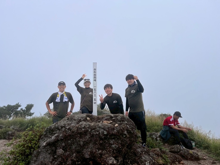 当日は山頂に雲が多く、霧に包まれた幻想的な雰囲気の中での登頂となりました。澄み渡る絶景とはいきませんでしたが、自然の迫力や仲間と登り切った達成感をしっかり味わうことができました。